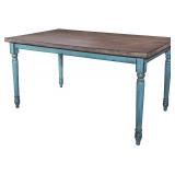 With a beautiful and calming blue finish, the Willow dining table will make a statement in your home. A burnished smoke finish on the tabletop provides a nice contrast with the teal blue dry brushed glaze finish and wormhole distressing on the table base.