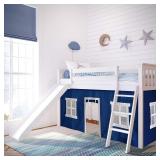 Max & Lily Twin Low Loft Bed with Slide and Blue Curtains, White