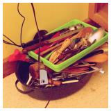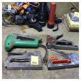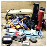 Lot of glue guns, glue stix, brush, measuring tapes, and flashlights