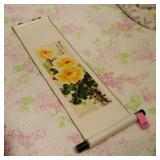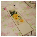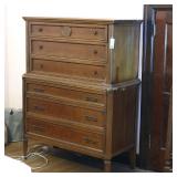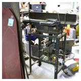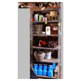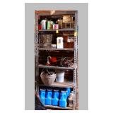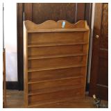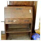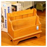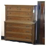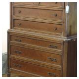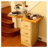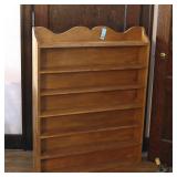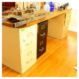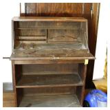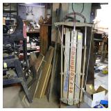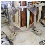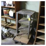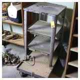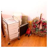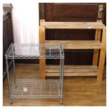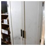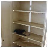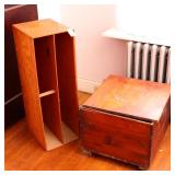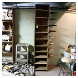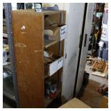 Shelf unit with wood plugs and wheils and white storage cabinet