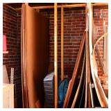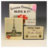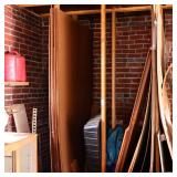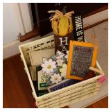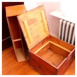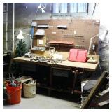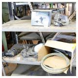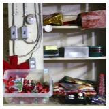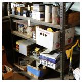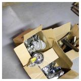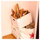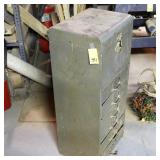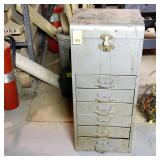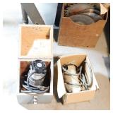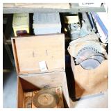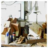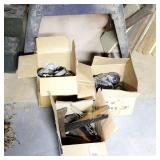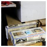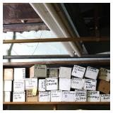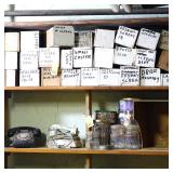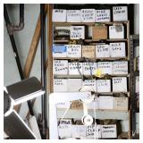 Lot of wooden boxes filled with hardware and a white storage cabinet