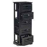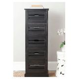 Sarina 5 Drawer Cabinet. Color-Black. Crafted of pine with distressed black finish, the British Colonial frame is updated with open handles and slatted drawers inspired by old-fashioned fruit crates. 16.5" X 12.6" X 46.5"