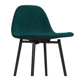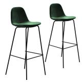 (Set of 2) Kody Upholstered Bar Stool. Color-Emerald Green. The metal base features four slim legs with crossbars that provide extra support and a spot where you can rest your feet. Up top, the low-back seat is upholstered in velvet with visible stitching for a sleek, modern look. 39" H x 14.25" W x 16" D