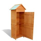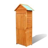 vidaXL Garden Storage Cabinet. Color-Brown. The two built-in shelves will help to keep small items in order. The waterproof polyester roof and water-resistant paint finish also protect your items from moisture. 31.1" x 19.3" x 74.8"