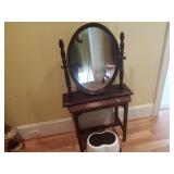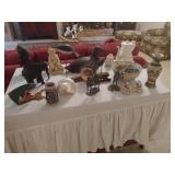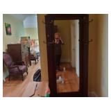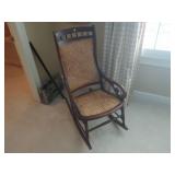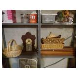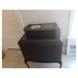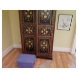 FINE ANTIQUES TO INCLUDE: Ornately carved wall clocks and mantel clocks, Turn of century Victrola, Vintage pottery to include McCoy, Roseville, hand carved Decoys. ornately carved three panel room divider. Many pieces of turn of the century fine antique furniture. Circa 1920’s black leather and framed wooden rocker. Hand floral painted w black single door antique cabinet.