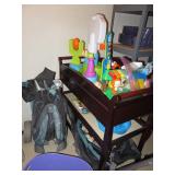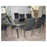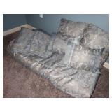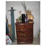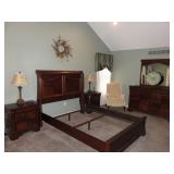 CHERRY 5 PC BEDROOM SLEIGH OUTFIT ANTIQUE BED, CHEST & SIDE TABLE ROCKER BEIGE MODERN DRESSER W/MIRROR & LIGHTED HEADBOARD BEIGE LEATHER SOFA LEATHER OTTOMAN OCCASIONAL TABLES, LAMPS & CHAIRS DINING ROOM TABLE W/6 CHAIRS & CURIO CABINET ARTWORK WALL DECOR TEAK DANISH TABLE W/6 CHAIRS & HAIRPIN TABLE & TWO LEAVES DARK WALNUT FORMICA TABLE W/6 CHAIRS KITCHENWARE, GLASSWARE, CRYSTAL SMALL KITCHEN APPLIANCES LINENS, BEDDING HOLIDAY DECOR SMALL AMMO SAFE SOME HUNTING STUFF TWO HUNTING BOWS LADDERS TRUCK EXTENSION CARRIER TOOLS DOLLY CAR JACK PORCH BENCH YARD TOOLS CHILDREN'S CLOTHING (NEW) GARAGE STUFF