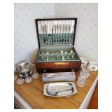 Glassware, supernova China set, crystal glassware, crystal serving bowl, bookshelf, Keurig coffee maker, community silver-plated silverware, silverware, kitchenware, mugs, serving tray, decorative serving tray, pots, pans, mugs, glasses, picture frames, decorative vases, serving pitcher, Laura Ashley vase, Romero Britto paperweight, decorative plants, wall mirror, dining table and chairs |