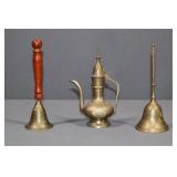 Lot of Two(2) Brass Bells and One (1) Brass Teapot.