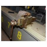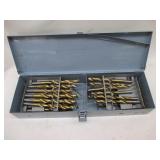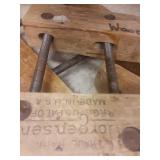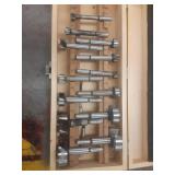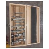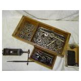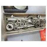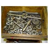 WOODEN BOX FILLED WITH TAPS AND DIES, SMALL VISE AND MORE, SEE PICTURES