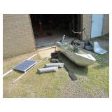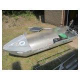 CLASSROOM MADE - HOMEMADE SOLAR POWERED 7.5 FT ALUMINUM BOAT WITH MINNKOTA ENDURA C2 5-SPEED 50 LB THRUST 12 VOLT MOTOR, SOLAR TECH 55 WATT 12 VOLT SOLAR PANEL, 26 INCHES BY 25 INCHES BY 1.4 INCHES. BATTERY BOX, MULTIMETERS AND HARDWARE. 7.5 FT BY 2 FT BY 1 1/2 FT. NO SHIPPING
