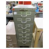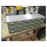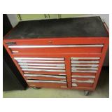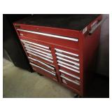 International 15 Drawer tool Cabinet on 5" Casters, good cond. Showing some wear (a quople door front handles are bent) comes with a few misc. Tools. No keys (sp) N/S