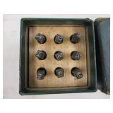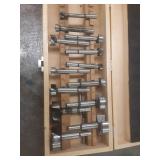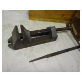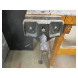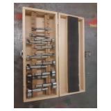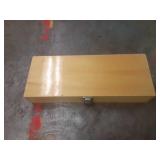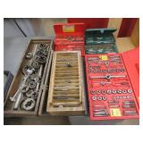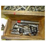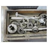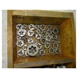 WOODEN BOX FILLED WITH TAPS AND DIES, SMALL VISE AND MORE, SEE PICTURES