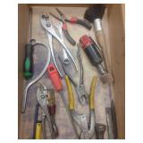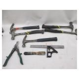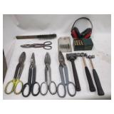 SHEET METAL SHEARS, STANLEY 14 INCH PLANE, (2) TOOL SHOP 16 OZ. FIBERGLASS CLAW HAMMERS, (3) ESTWING CLAW HAMMERS