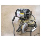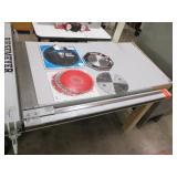 PORTER CABLE HEAVY DUTY ROUTER (TESTED AND WORKING) #1001 WITH FIXED BASE, MOUNTED IN A BENCH DOG PRO TOP PORTABLE ROUTER TABLE WITH 22 INCH DUAL POSITION FENCE, 2 1/2 INCH DUST PORT AND AN ALUMINUM MITER ACCESSORY TRACK. 24 INCHES BY 16 INCHES BY 20 INCHES TOP HAS A SMALL CRACK IN THE LAMINATE. COMES WITH A TABLE 3 FOOT BY 2 FOOT BY 3 FOOT ON 3 INCH CASTERS AND A POWER STRIP. NO SHIPPING
