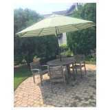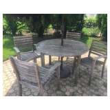 - Beautiful Rustic Wood Round Patio Table, 4 Chairs, Umbrella