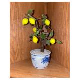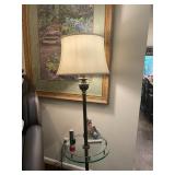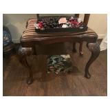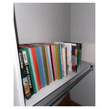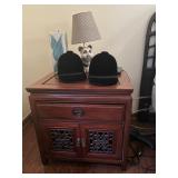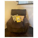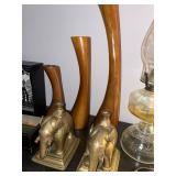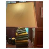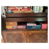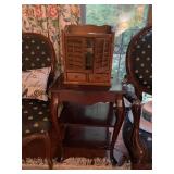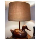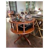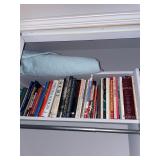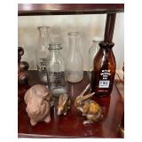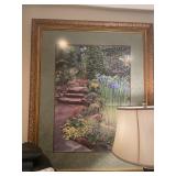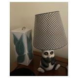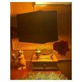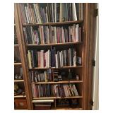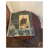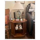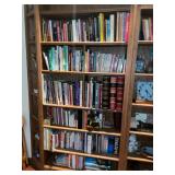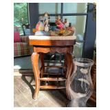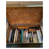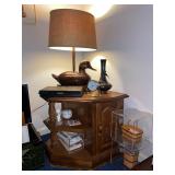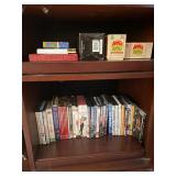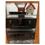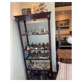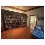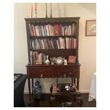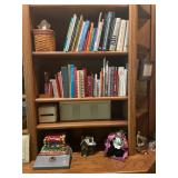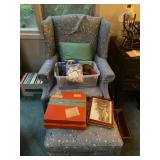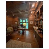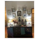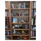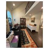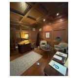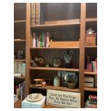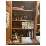 Library Small veneered table, Blue animal print chase lounge, throw pillows, Sunset watercolor by Patricia Meyers, large selection of books, ceramic lamp, painted glass butterfly lamp, Boyds Bears and friends, cassettes, hand engraved duck box, vintage scale, music box, peacock plates, soldiers in glass jar, stuffed animals, teddy bear lamp, wooden seal, sheriff coasters, bonsai tree, H.L. McGregor Jr national twish drill and tool co, Sand jars, glass duck lamp, duck figurines, glass decanter, wooden dog figurine, glass jars, book safes, wooden stool, brass Rockinghorse, small lemon tree, Norman Rockwell plate, willow tree hug box, crystal and brass duck, penguin statue, LG DVD player, Marantz AV surround receiver, Yamaha natural sound stereo receiver, CDs, speaker, glass display shelf