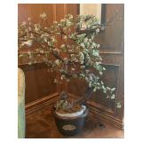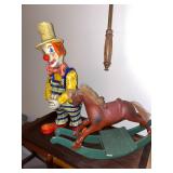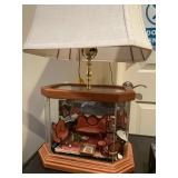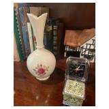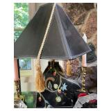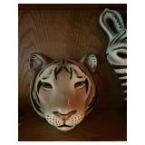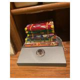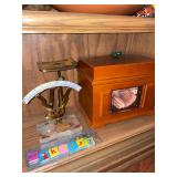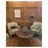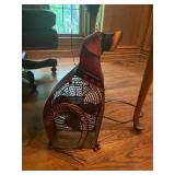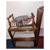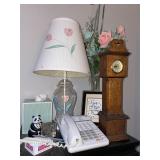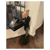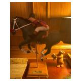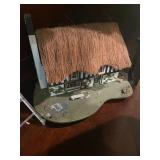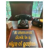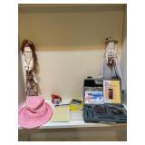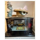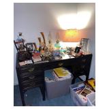 Office Bassett two drawer chest, equestrian sculpture by Audrey Schulz, the American collection “joes service”, peacock feather fan, vintage lamp, golden retriever stool, radio, ceramic jug, pair of matching striped arm chairs, Wooden bungalow doll house, Casio digital camera, deluxe talk boy cassette player from home alone two, asian inspired brass top pedestal table, camera case, large bonsai tree, framed map of Saint Clair County, Avon Township offices framed sketch, Trinidad steel pan, vintage office desk, dog fan, book lamp, Disney photographs, equestrian sculpture by Audrey Schulz, antique pager, desk clock, letter opener, books, photo box, the lone sailor sculpture, the American collection toppers drive-in, luggage labels, small safe, the tale of Peter rabbit plate, the house of miniatures doll house furniture, Lennox American bear, original art by Sherry Goshon, The city of Detroit print, large leather studded office chair, wooden model airplane, ceramic dishes & pots, ceramic zebra mask, ceramic tiger mask, ceramic masquerade masks, hand printed photograph of Ireland (1890), flags of America booklet, office supplies, CD holder, area rug