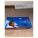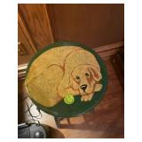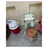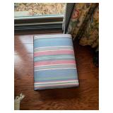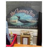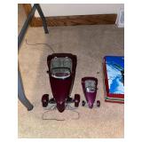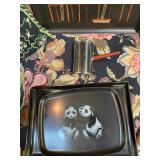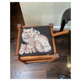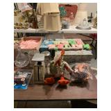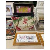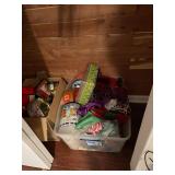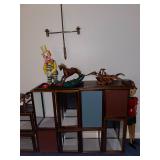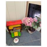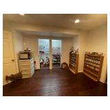 Downstairs Landing TV trays, stuffed animals, beanie babies, cabana babe by Sharon Andrews, Webkinz, cat pillow, fake leather recliner, dog bed, wicker picnic basket, wicker table, books, concours d’élégance framed posters, vintage car posters, needlepoint of birds, armchair, clear table lamp, floral needlepoint pillow, frog needlepoint, Blue and white planters, Mallard comforter and pillows, shark vacuum, bissell vacuum, children’s play toys, children’s little tykes bicycle, bathrobes