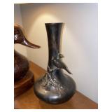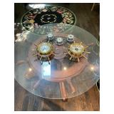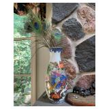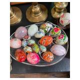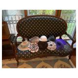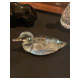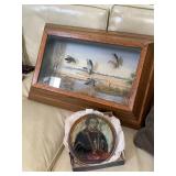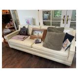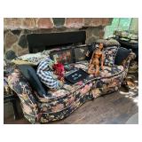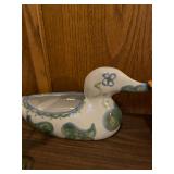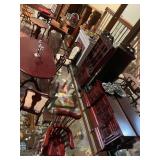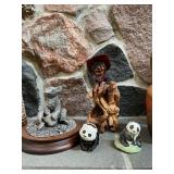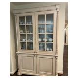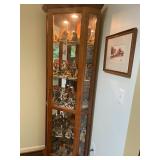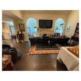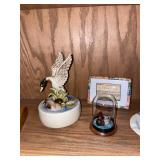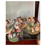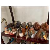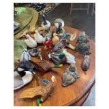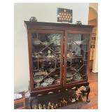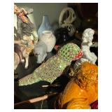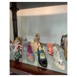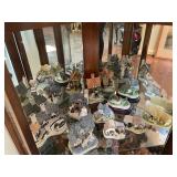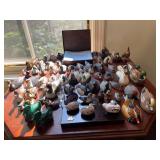 Living room Large collection of the shoemakers dream by John Herbert figurines, curio cabinet, hand-carved wood fishing figurines by a peer import Sweden (signed), Silver platter, crystal ball, side table, large faux white leather couch, scene of birds flying in dark box, Arias figurines and knickknacks, the Judith G collection, The gentle hunter, various clocks, American eagle mantle clock, naval style clocks, African wood carvings, brass plate, handpainted eggs, stone eggs, Coalport place cards, Glass penguin figurines, Handpainted lamp with black shade, handpainted Chinese plate, Chinese side table, floral sofa, needlepoint pillows, giant panda figurine, wood carvings of children, Chinese hand-painted paws, Chinese ginger jars, silver plate: platters, dishes, salt and pepper shakers. Chinese bowls, Chinese vases, set of Chinese teacups, Chinese Famille rose plates, gorgeous ginger jar on stand with glass top table, six green chairs, collection of ducks and mallards of North America, just the right shoe collection, glass ducks, brass ducks, porcelain ducks, Royal Copenhagen Mallard, Royal Copenhagen quail, bear and Jade ashtray, tiles, Persian style hand-painted tile, mallard collectible plates, panda painted on marble by Sherry Morgan, Norman Rockwell “spirit of America” commemorative figurine,
