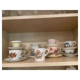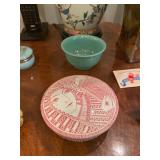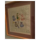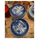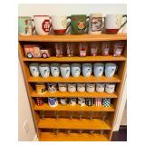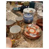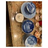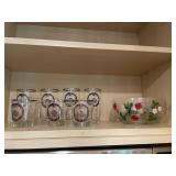 Downstairs kitchen pink floral arm chair, snowman plates, Christmas mugs, lavender sachet‘s, baking pans, cake display, coffee press, Christmas dishes, stuffed monster, Wedgewood blue and white bowls, KLM airlines blue delfts Bols, Collection of mason jars,