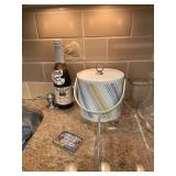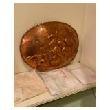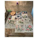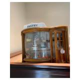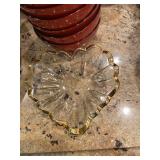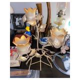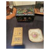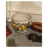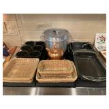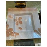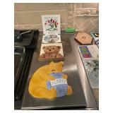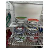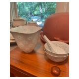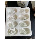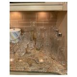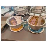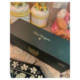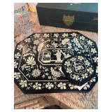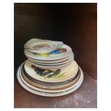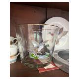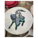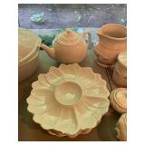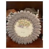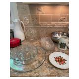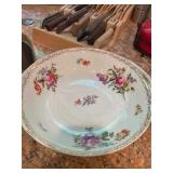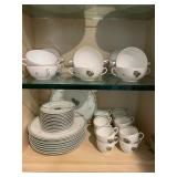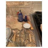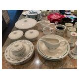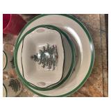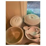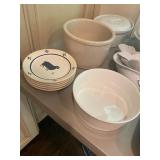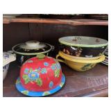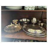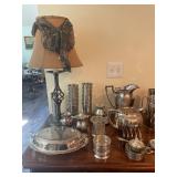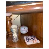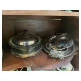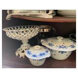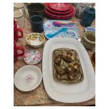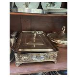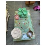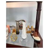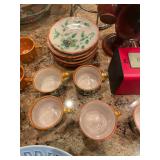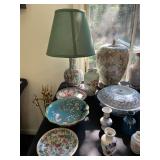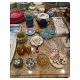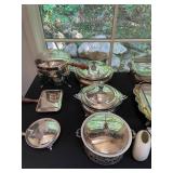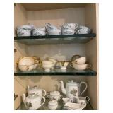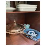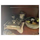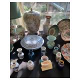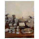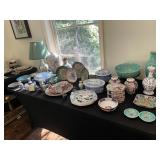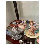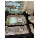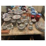 Kitchen Silver candle sticks, pewter candlesticks, silver plated salt and pepper shakers, pitchers, and platters, BNG made in Denmark China set, Lenix China set with gold trim, Arabia made in Finland green China set, decorated in Hong Kong huge China set with pink and green flowers, fathers, etched orchid vase, collection of tea cups, longer burger set of dishes with creamer, salt and pepper, platters, teapot, cookie jar and bowls. Floral plates, longer Berger she plates, fish platters, bread baking terra-cotta, Orvis wine rack, Lemon canisters for bread, flour, coffee, T. Seng & co gorgeous gold and black flatware set, knives, cow clatter, mini Bundt cake rack, Winnie the Pooh hotplate, floral tiles, anniversary plates, tea cup sets, Wedgewood sugar bowl, Porcelain the Paris plates of Chinese prophets, Credenza