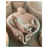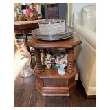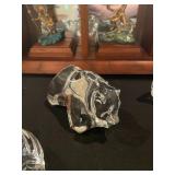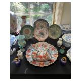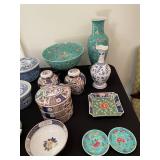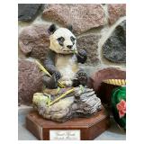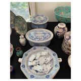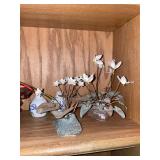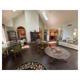 Living room Large collection of the shoemakers dream by John Herbert figurines, curio cabinet, hand carved wood fishing figurines by a pier import Sweden (signed), Silver platter, crystal ball, side table, large faux white leather couch, scene of birds flying in dark box, Arias figurines and knickknacks, the Judith G collection, The gentle hunter, various clocks, American eagle mantle clock, naval style clocks, African wood carvings, brass plate, handpainted eggs, stone eggs, coalport place cards, Glass penguin figurines, Handpainted lamp with black shade, handpainted Chinese plate, Chinese side table, floral sofa, needlepoint pillows, giant panda figurine, wood carvings of children, Chinese hand-painted paws, Chinese ginger jars, silver plate: platters, dishes, salt and pepper shakers. Chinese bowls, Chinese vases, set of Chinese tea cups, Chinese famille rose plates, gorgeous ginger jar on stand with glass top table, six green chairs, collection of ducks and mallards of North America, just the right shoe collection, glass ducks, brass ducks, porcelain ducks, Royal Copenhagen Mallard, Royal Copenhagen quail, bear and Jade ashtray, tiles, Persian style hand-painted tile, mallard collectible plates, panda painted on marble by Sherry Morgan, Norman Rockwell “spirit of America” commemorative figurine, silver plated serving dishes and platters, panda plates by Will Nelson, antique China cabinet, the pandas of wu zuoren plate set, porcelain fruit bowl, Sara purifoy collection dishes, paddington plates, Fredrick Cooper wood and brass ducks, Boehm porcelain panda, Chinese jade bonsai trees, Hopi pottery vase, Franklin mint crystal icebergs,