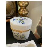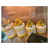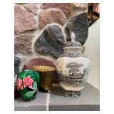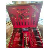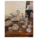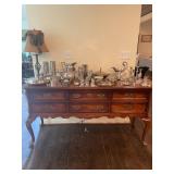 Kitchen Silver candlesticks, pewter candlesticks, silver-plated salt and pepper shakers, pitchers, and platters, BNG made in Denmark China set, Lenix China set with gold trim, Arabia made in Finland green China set, decorated in Hong Kong huge China set with pink and green flowers, fathers, etched orchid vase, collection of teacups, longer burger set of dishes with creamer, salt and pepper, platters, teapot, cookie jar and bowls. Floral plates, longer Berger she plates, fish platters, bread baking terra-cotta, Orvis wine rack, Lemon canisters for bread, flour, coffee, T. Seng & co gorgeous gold and black flatware set, knives, cow clatter, mini Bundt cake rack, Winnie the Pooh hotplate, floral tiles, anniversary plates, teacup sets, Wedgewood sugar bowl, Porcelain the Paris plates of Chinese prophets, Credenza,