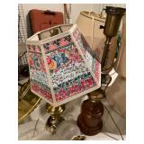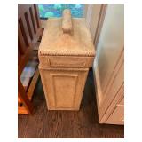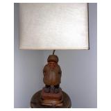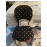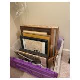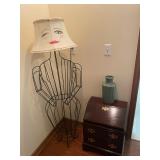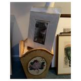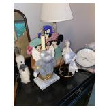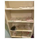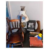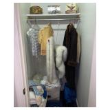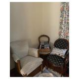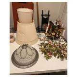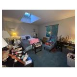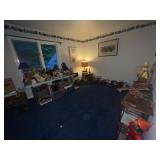 Basement bedroom birdhouse lamp, baby toys, miscellaneous baby, vintage clothing, dresses, linens, towels, lampshades, floral arm chair, wooden carved pieces by Anri, Anri weather forecast and two other unnamed pieces, Picture frames, blankets, first, sheepskin, for pills, dark clothing, baby bassinet supplies, suitcases,