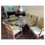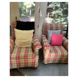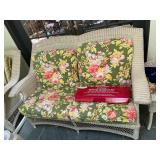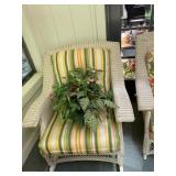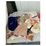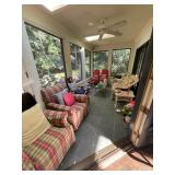 Sunroom Pair of pink and green armchairs, wood baths chair, Barbies, Barbie clothes, Barbie car, miscellaneous Barbie and Ken supplies, pink chairs, decorative pillows, yellow pink and green wicker rocking chair, floral wicker sofa, Wicker side table, collection of vintage fans