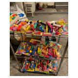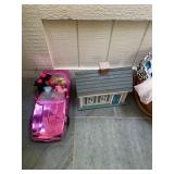 Sun room Pair of pink and green arm chairs, bassett dining chair, Barbies, Barbie clothes, Barbie car, miscellaneous Barbie and Ken supplies, pink chairs, decorative pillows, yellow pink and green wicker rocking chair, floral wicker sofa, Wicker side table, collection of vintage fans, ceramic pot, ceramic tile patio table, barbecue accessory kit, doll house