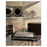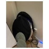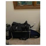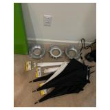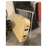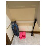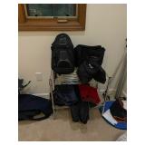 Storage room indoor swings, Wood headboard, Baby gate, dog cage, blowup mattress, sleeping bag, trouble, camping supplies, fire starters, Coleman matches, orange canvas, Floaties Cesar Millan backpack