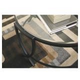 Casserly 3 Piece Coffee Table Set. Color-Black. Casual contemporary styling. Thin line metal arc x-motif leg design. The top has inset with beveled edge clear tempered glass for a modern feel. Coffee Table 18'' H x 36'' L x 36'' W