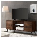 60 Inch Mid Century Modern TV Stand - Dark Walnut. The sleek metal hardware, angled legs, and boxy frame create an overall mid century modern aesthetic. 65.00 in (L) x 22.00 in (W) x 6.00 in (H)