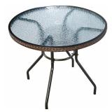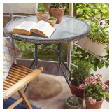 Tullahassee Bistro Table. Color-Brown. On the edge of the round table, a woven rattan decorates the table specially. A parasol hole on the table is used for holding an umbrella in order to prevent you from sunshine and rains. Overall 27.9'' H x 32'' L x 32'' W