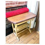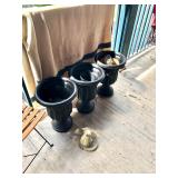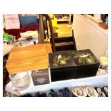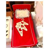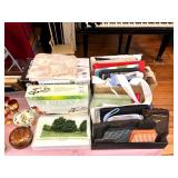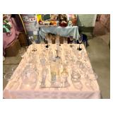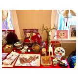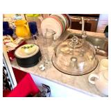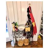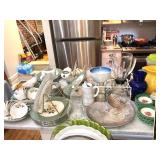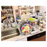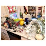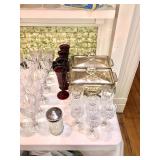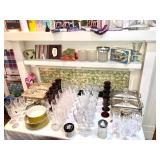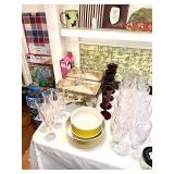 Kitchen * Vintage Metal Canister Set * Yogurt Maker * Metal Kitchen Stools with Upholstered Pads * Wood Slat Folding Chairs * Utensils * Serving Pieces * Pots and Pans * Cast Iron pan * Glass Cake Server * Decorative Plates From Europe * Metal 2 Tiered Short Bakers Rack * Crock pot * Fondue Pot * Linens * Aqua Globes for Flowers and Plants NIB * Vintage Red Cut To Clear Stemware * Casseroles * Silver Plated Double Compartment Chaffing Dishes * Riedel Wine Glass * Lolita Wine Glass *