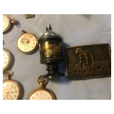 ANTIQUES & COLLECTIBLES: Pocket watch collection (over 25 different pocket watches) including Hamilton, Seth Thomas, South Bend, Rockford, B.W. Co., Illinois, Hampden, American Waltham, Elgin etc., Wrist watches, Gold rings, Sterling silver rings, Sterling silver jewelry, Vintage costume jewelry, Compass, Firkin with original paint, Rare blue Perfection oil heater, Pocket knives, Stoneware, Wheaties License plates, General Mills license plates, Matchbox cars, Antique MacGregor softball w/ box, Vintage baseball glove, Breyer horse collection, Early Planters Peanuts jar, Planters Peanut salt & pepper, Noritake Greenbay china set, Procter & Gamble advertising wooden boxes, Edgeworth Pipe tobacco tin, Vintage Morton salt, Vintage Ivory Snow box, New York Central RR railroad lantern, Remington arms Kleanbore wooden box, Duck decoys, Copper boiler, Buddy L fire truck, Tramp art, Model trucks, Vintage yearbooks, Basket, Hamilton desk clock, Bulova clock, Foreign currency and coin collection, Morgan silver dollars, Peace silver dollar, Silver half dollars, Silver quarters, Silver dimes, Large cents, Oversized note, Advertising thermometer, Albany Business College 175th graduating class framed photo, Lighter, Cameras, General Mills license plates, Texaco & Sunoco maps, Mason jars, Porcelain vases, Silver carved Last Supper framed, 1968 US Proof Set, 1969 US Proof Set, 1976 United States Bicentennial Silver uncirculated set, Franklin Mint Antique car coins set, Large collection of blue and white graniteware and enamelware, Ertl fire trucks, Collectible plates, Bausch & Lomb custom armored binocular, Wooden display cabinet, Dolls, Antique car prints, Stuffed animals, Nativity set, Christmas ornaments, Handmade quilt, Collectible plates, Paintings, Currier & Ives Indian Town print, Vintage ephemera and photos, Chandler antique prints, Hand made purse, Macy's Thanksgiving Day Parade 75th Anniversary waterglobe, Pfaltzgraff, Corningware, Pyrex, Linens, and much more.
