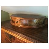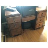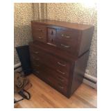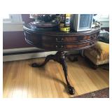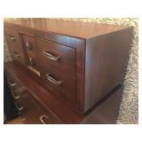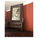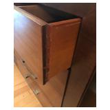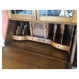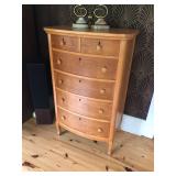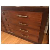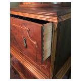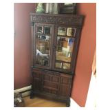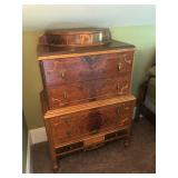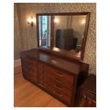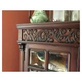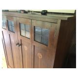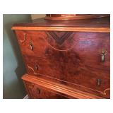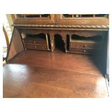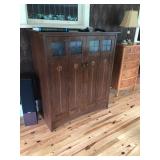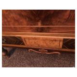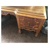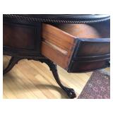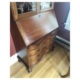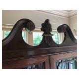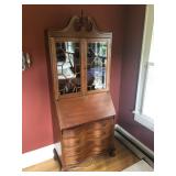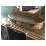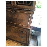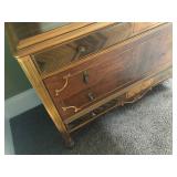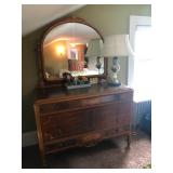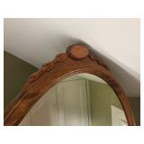FURNITURE: 4 Pc. Mid Century Modern bedroom set w/ full sized bed, Gorgeous match mahogany secretary, Gorgeous 5 Pc. Art Deco mahogany bedroom set w/ vanity, Mahogany secretary, Large mahogany round table w/ ball and claw feet, Oak high chest, Unique Stickley inlaid oak glass paned entertainment center, Nice changing mirror, Gorgeous antique corner cupboard, Oak desk, High chest of drawers, Wicker night stand, Alabaster pedestal, Upholstered chest, High shelf, 2 tier mahogany end table set, Large carved mirrors, Set of 4 older wooden folding chairs, Ottoman, Adirondack style chairs and much more.