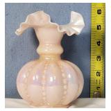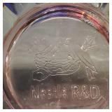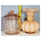 8" Fenton Rose Overlay melon rib vase, pink depression glass 3 1/4" Adam / Star and Flowers" ash tray (slight roughage to bottom edge), 8 octagon 7 1/2" diamond optic plates, 7" ringed band cookie jar, 3 footed ribbed bowl with spider web optic medalion and 2 urn form 9 1/4" vases, ruby flash pair of 13" paneled pedestal candy jars with diamond point accents, 5" King's Crown compote and pink flash ball rim ash tray - local pick up only or buyer arranges third party packing and shipping 601