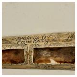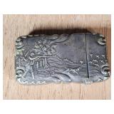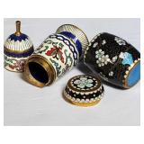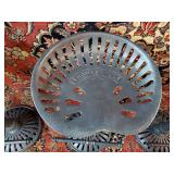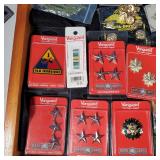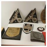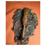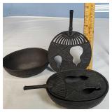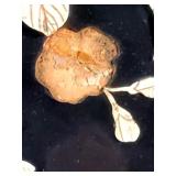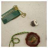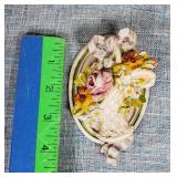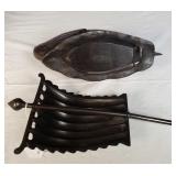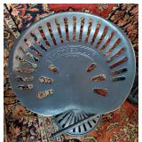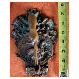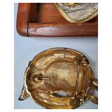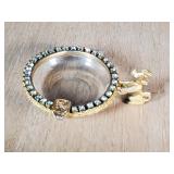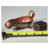 wick trimmer scissors, metal train paperweight, tea strainer ladle with holder pat 1911, Lil Bandito raccoon with cookie jar shelf accent, abalone tiled ball with holder, rinestone lined ormolu poodle rimmed glass ash tray, antique hunting scene SP match safe, 3 bathing beauty figures, 5" antique German paper mache turkey candy container, "Tin Star" shadowbox sherrif display, Terre de Fer HB&Cie France blue and white scenic small plate, Royal ALbvert Old Country Roses Ruby Collection Ribbon Collection 2002 Event Exclusive bowl with gold accented foot - contents only - local pick up only 636