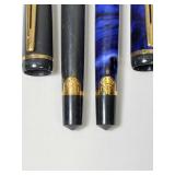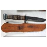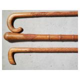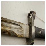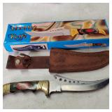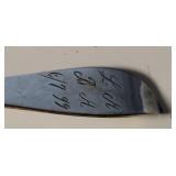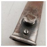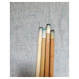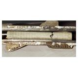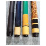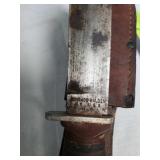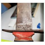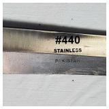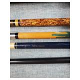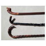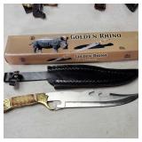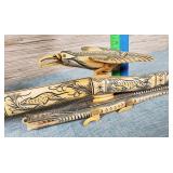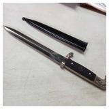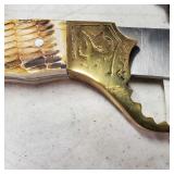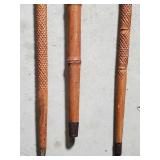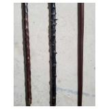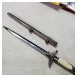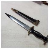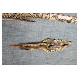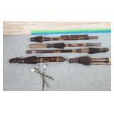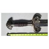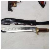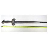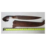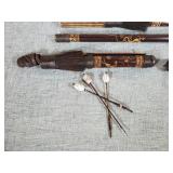 20" Keris/ Kris with sinuous blade, inlaid wood handle and carved wood sheath (separated),20" Keris with traditional carved hardwood pontil, (hairline in handle) machete style blade and wood sheath with point and hilt design carvings,22" wood training blade/ fighting baton, 42" horse head hilt fantasy sword #440 stainless steel and 31" Pakistan steel sword with stylized handle, tapered leaf form blade and leather sheath -with padded plastic carrying case {in house shipping available} 637
