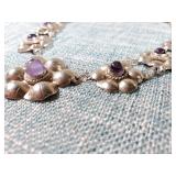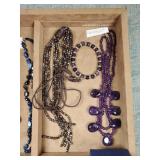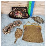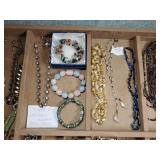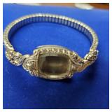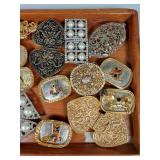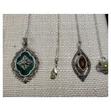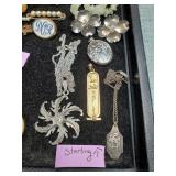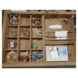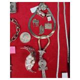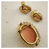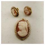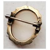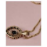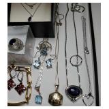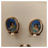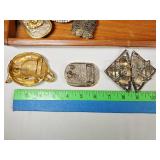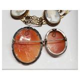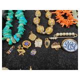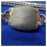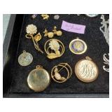 Including, 1-Gold filled Hampden pendant / wrist watch with cloth band, 1-Ladies Bulova 10k gold filled wrist watch with slide bead adjust mesh band, 3 pc. shell cameo screw back earrings and matching pendant / brooch, 12K gold filled, 1-miniature hand painted oval porcelain brooch 2 1/4" X 1 3/4" brass backing with steel pin, 2- gold filled lapel pins jr LSS red cross, and S.M.S 28, 1- art deco blue stone and chrome choker necklace, and one iridescent shell necklace. {in house shipping available} 22
