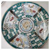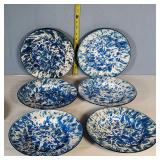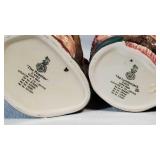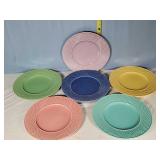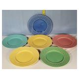 Celebration pattern features a plane center with beautiful basket weave embossed rims in tones of green, light and deep blue, lavender, rose and yellow - mark reads "Bordallo Pinhiero Caldas Da Rainha Made in Portugal" - 6 each 12" dinner,10" salad and 8" dessert/ bread plates with 9 mugs - some minor wear marks and occasional crazing to plates, all still with great eye appeal, mugs seem perfect - see photos for details - Local Pick up Only OR Buyer arranges ALL Shipping and Packing through third party 626