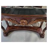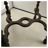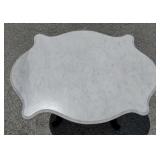 28" tall with 39" x 29" white marble turtle back top with beveled edge raised on 4 column pillar base with center place accent shelf and 4 fiddle head curved feet {Local pick up only or buyer arranges third party packing and shipping} 596