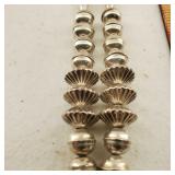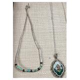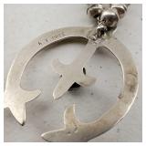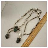 This Navajo Vintage Pawn Hand Crafted Sterling Sliver And Royston Turquoise Necklace has a 3 1/8" X 3 1/8" Naja pendant with 3 Royston Turquoise Cabochon, hanging from a sterling silver 28" chain strung with hand crafted beads. 3.270 total weight {in house shipping available} 6