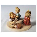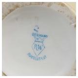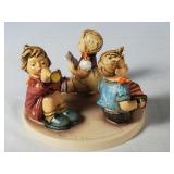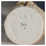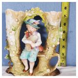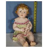 one baby holds a cup, the other a doll (both need a good cleaning, but no breaks, cracks or chips), one with red number and arrow mark on base, spill vase features seated bagpiper between 2 vase ends making an arch above his head, marked Made in Germany on base - in house shipping available 629