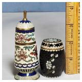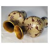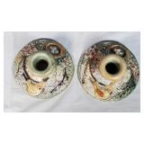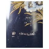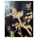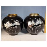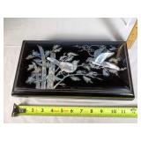 Pr of 9" vases, pr of 8" ginger jar vases (no lids, some loose mother of pearl pieces) and 12" long smoke set box with MOP bird on branch lid, inside brass ashtray and cigarette box insert with MOP calligraphy mark lid - some minor lacquer issues - in house shipping available 620