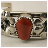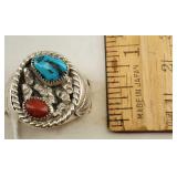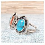 2 Navajo Cuff Turquoise & Coral Sterling Silver Cuff Bracelets
