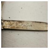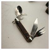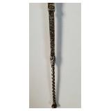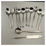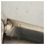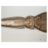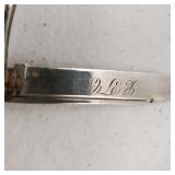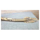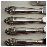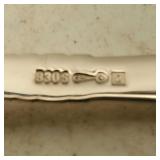 1 - NM Norsk Monster Viking Rose 830s Silver Norwegian Olive Fork 4 3/8” designed By TH Marthinsen , 4 - NM Norsk Monster 830s silver Vidar dinner knives, 4 - Royal Danish International Sterling Coffee Spoons, 3 - Norwegian Brodrene Mylius "Tele" coffee spoons wih gold wash.1- silver handle cheese shaver, 1- Marthinsen Sterling Silver handle pastry tongs. 1- MOP handle with silver collar bread knife. total weight 21.390 ozt. {local pick up or in house shipping available} 34