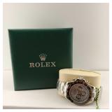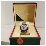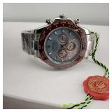 Working Rolex Replica Wrist Watch, lovely light blue face with burgundy bezel, stainless steel case and bracelet. With green display box, outer box, tag, papers, and handled bag. alot of effort went into this Replica Rolex Watch. {in house shipping available} 5