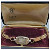1-Elgin Ladies wrist watch with original display case, vintage band, winds not working, 1-Gruen Men's wrist watch rose gold plate, matching band, with original display case, working, needs band pins, 1- Bulova Art Deco,14k rose gold filled, with band, 17 jewel men's wrist watch, not working 1- Bulova Art Deco 10k yellow gold filled with band, 17 jewel men's wrist watch, not working 1- Bulova 10k gold plate, 15 jewel, with band, men's wrist watch, working 1- Bulova 10k rolled gold plate, with band, 17 jewel, 1-Bulova Art Deco 10k rolled yellow with band, as is wrist watch, 1- Hamilton 10k yellow gold filled 17 jewel, men's wrist watch, working, no band, Elgin 10k white gold filled , 15 jewel pocket watch, cracked crystal. 1- Elgin black face 15 jewel, parts only rust inside pocket watch. 1- Timex Automatic,as is. { in house shipping available} 29